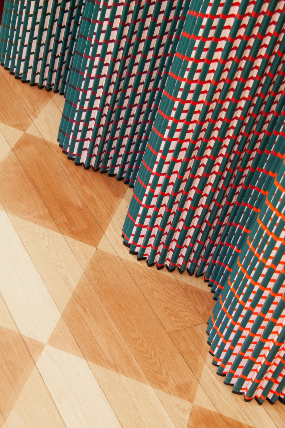 ABOUT Plissade is a sculptural all-textile room divider. Its vibrant colours create optical illusions reminiscent of gem facets. The product prioritizes circularity, and stands without additional support thanks to the use of an innovative pleating method and binder and adhesive-free stiffening techniques.